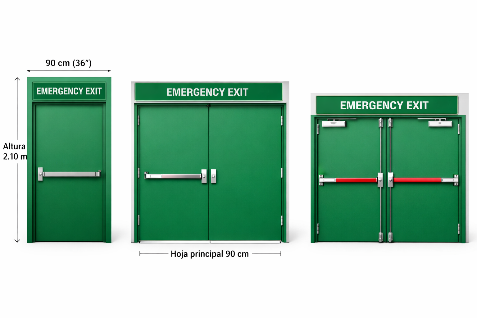 - 90 cm (36 pulgadas) es la medida más común y aceptada para una puerta de emergencia individual.